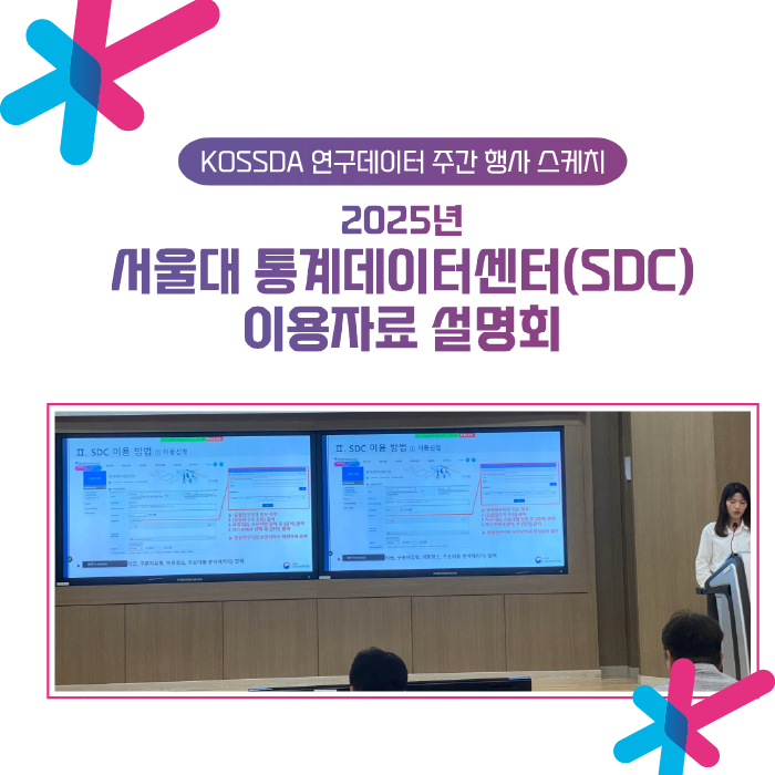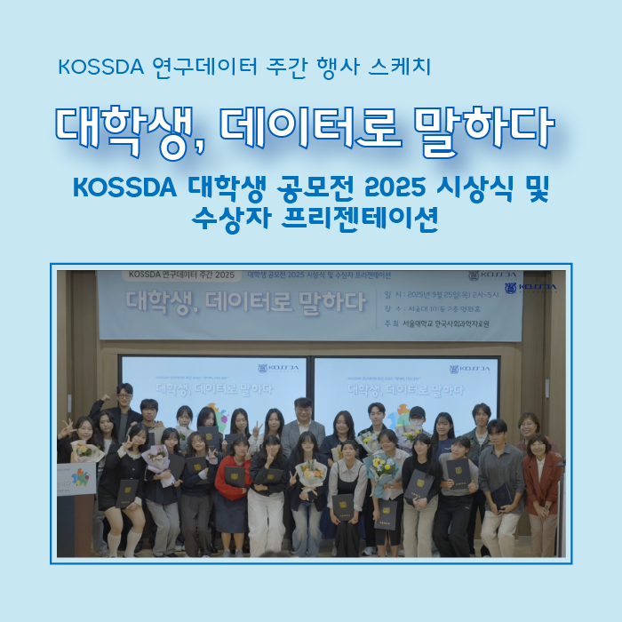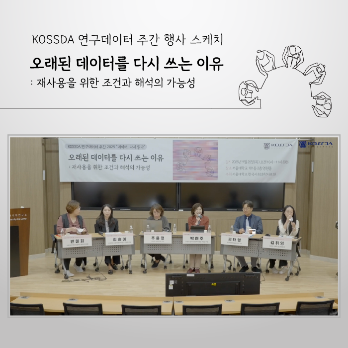 | | | 서울대학교 한국사회과학자료원(KOSSDA)은 '데이터 다시 읽다'를 주제로 지난 9월 23일(화)부터 26일(금)까지 "KOSSDA 연구데이터 주간 2025"를 개최했습니다. 데이터 수집부터 재이용까지 연구데이터 생애주기를 아우르는 배움과 소통의 장으로 열린, 이번 연구데이터주간에는 총 4개의 행사가 열렸습니다. 이 중에서 3개 행사 스케치와 유튜브 다시보기 영상을 통해, 기존 데이터를 새로운 시각으로 재해석하고 창의적으로 활용하는 구체적인 방법과 사례들을 만나 보시기 바랍니다.